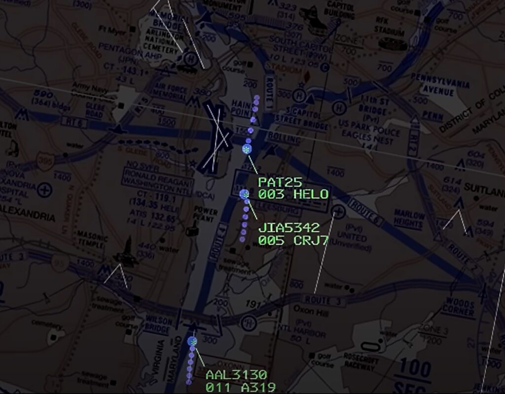 - Torre de KDCA en frecuencia militar: “PAT25, tráfico al sur del puente Woodrow, un CRJ, está a 1,200 pies estableciéndose para la pista 33.”
